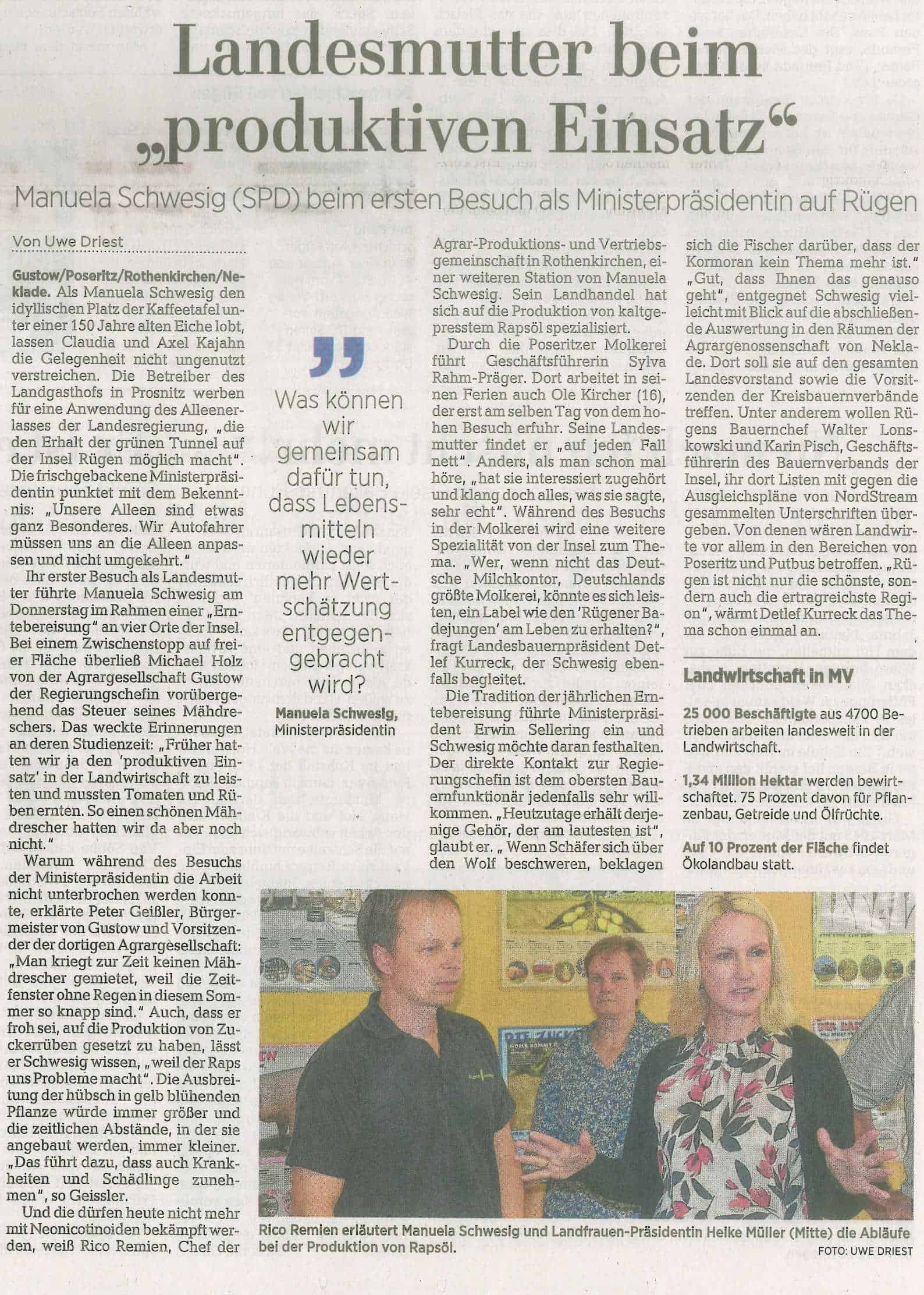 Schwesig setzte mit ihrer Erntetour eine von ihrem Vorgänger Erwin Sellering (SPD) begründete Tradition fort. Es gehe ihr mit dem Besuch auch um die Wertschätzung der in der Landwirtschaft geleisteten Arbeit. „Jeden Tag frische und gesunde Lebensmittel auf dem Tisch zu haben, ist keine Selbstverständlichkeit“.