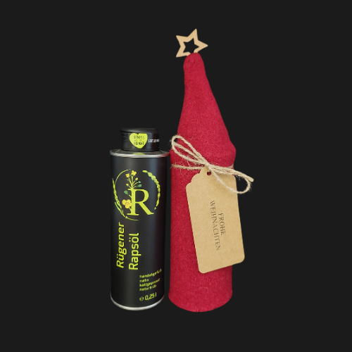 Eingehüllt in eine handgefertigte Zipfelmütze aus einem hochwertigen warmroten Wollwalk-Stoff präsentiert sich unsere 0,25l Dose mit bestem Rügener Rapsöl zur Weihnachtszeit. Ein hübscher Holzstern in einem warmen Goldton verziert den Abschluss der Zipfelmütze. Außerdem trägt der „Wichtel“ ein Etikett aus Pappe mit der handgestempelten Aufschrift „Frohe Weihnachten“. Auf der Rückseite des Etiketts lässt sich unser „Wichtel“ noch individualisieren. Hier ist Platz für eine persönliche Botschaft an Ihre Lieben. Die Gesamthöhe des Wichtels beträgt etwa 28 cm bei einem Durchmesser von 6 cm. Das Etikett hat eine Größe von 4,5 x 9,0 cm.