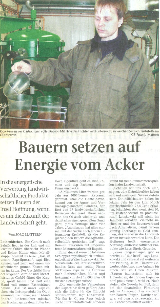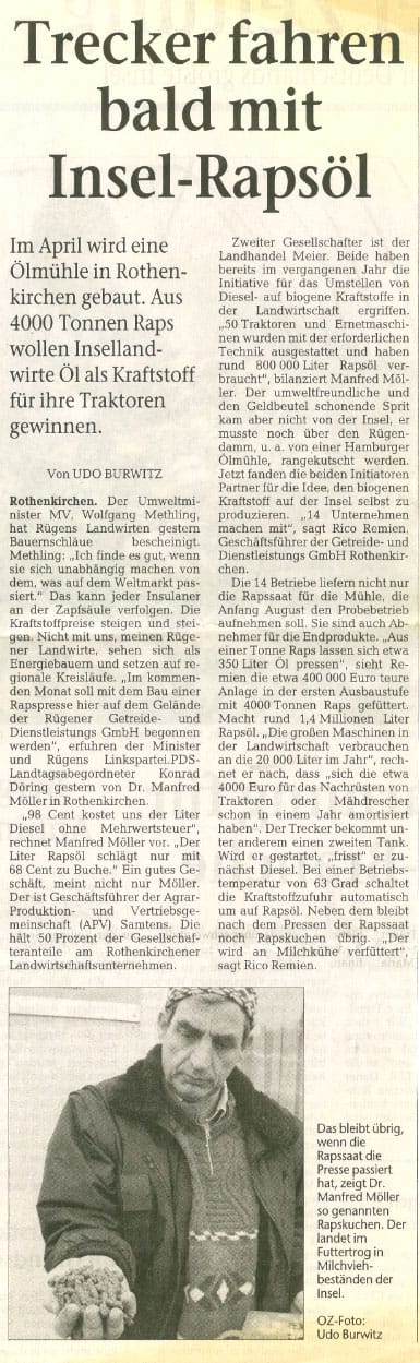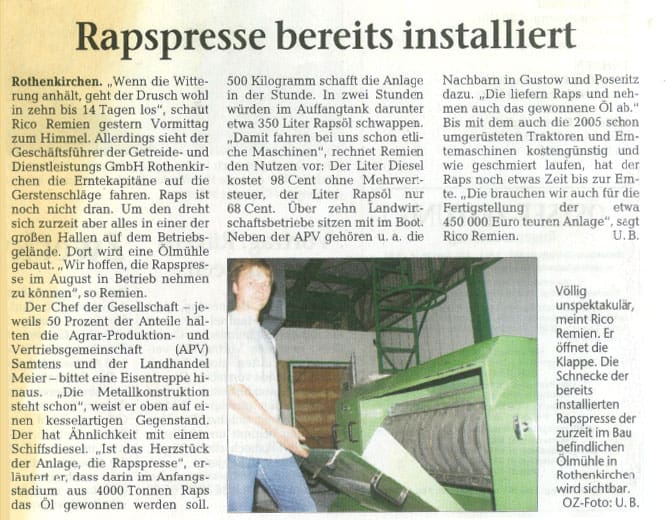 - 18.09.2006 (OZ) – Mühle presst Energie aus Raps