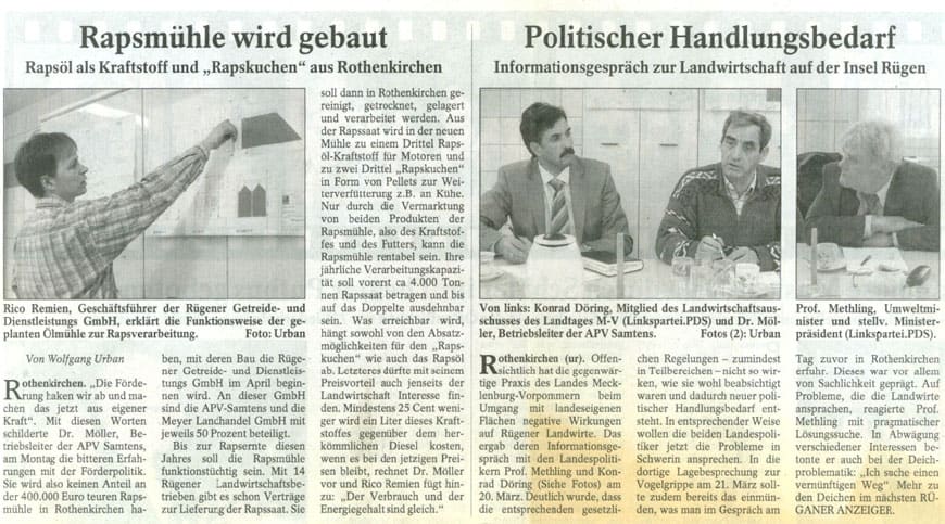 - 22.03.2006 (RAZ) – Rapsmühle wird gebaut / Politischer Handlungsbedarf