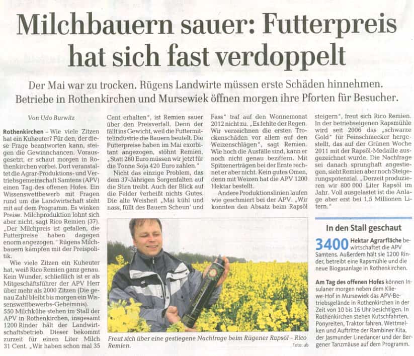 - 02.03.2012 (OZ) – Milchbauern sauer: Futterpreis hat sich fast verdoppelt